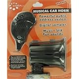 Automotive public address (PA) system with built in songs, sound effects and voice phrases. Plays over 80 built-in novelty and fun songs and sounds such as La Cucaracha, Dixie, animal sounds, holiday songs, etc. Plus you can record up to 10 seconds of your own audio to playback. Fun novelty device for a car, truck, or any other vehicle. The complete ergonomic electronic unit fits into the palm of your hand. Comes with horn to mount under the hood or elsewhere in the vehicle. Connects to a standard cigarette lighter and comes with hook up wire for a more permanent installation.